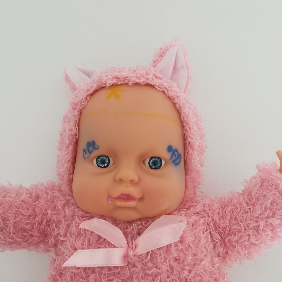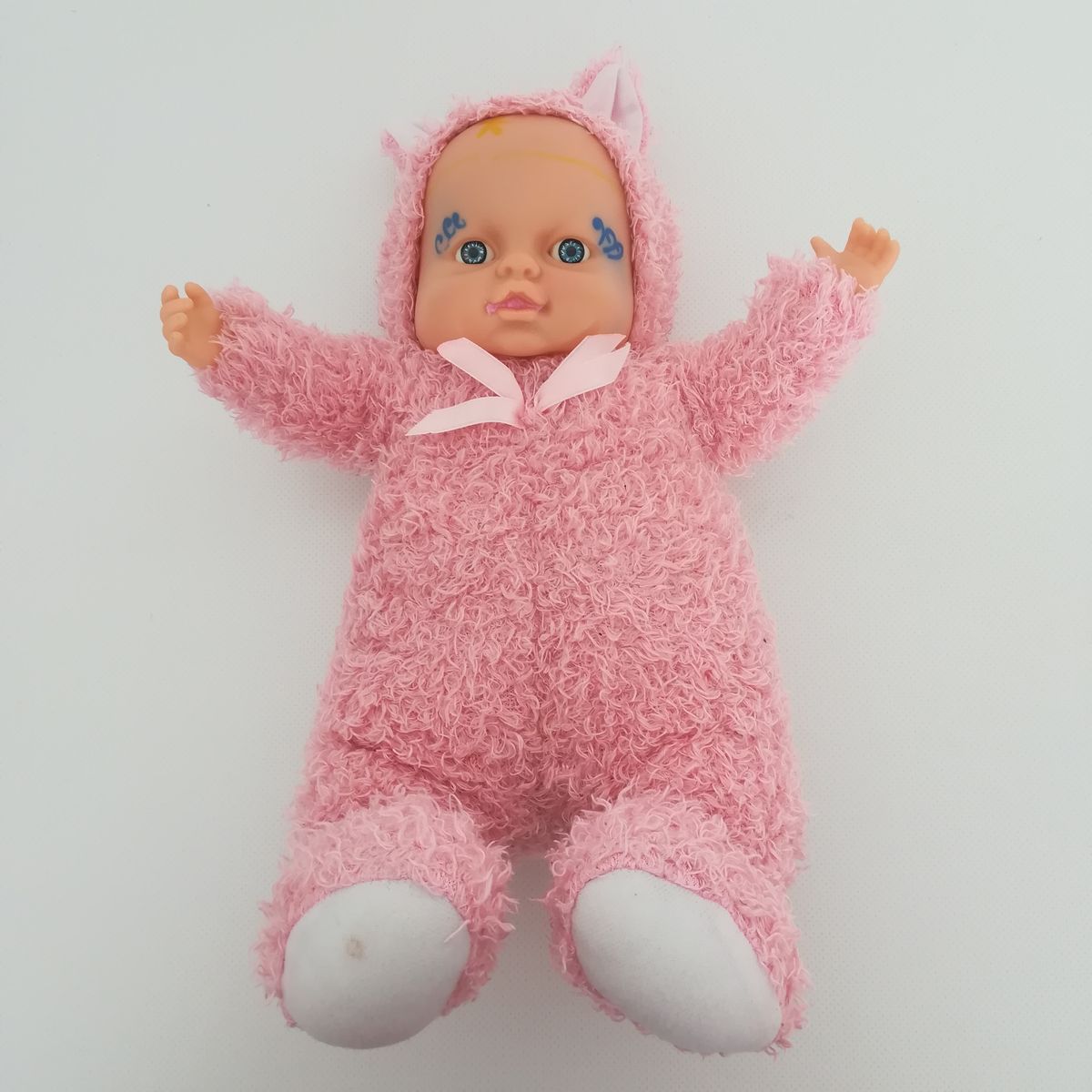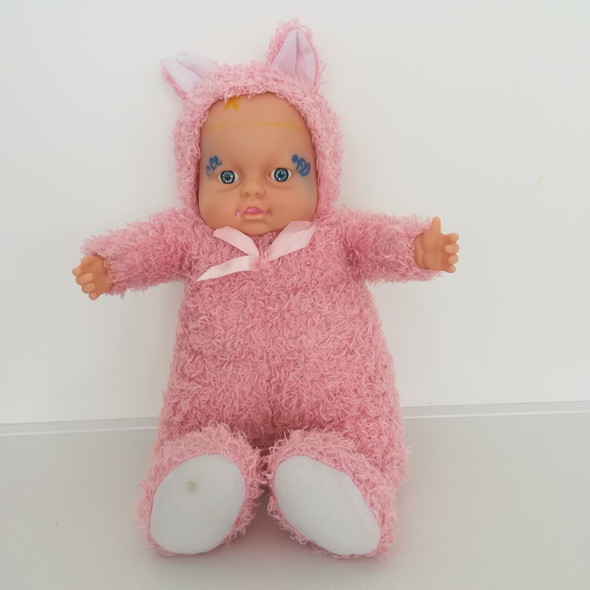 Használt állapotú Anne Geddes jellegű, rózsaszín állatjelmezes, kék szemű baba figura főbb jellemzői: