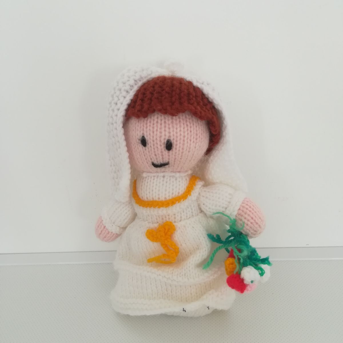 Barna hajú horgolt menyasszony fátyollal virágcsokorral