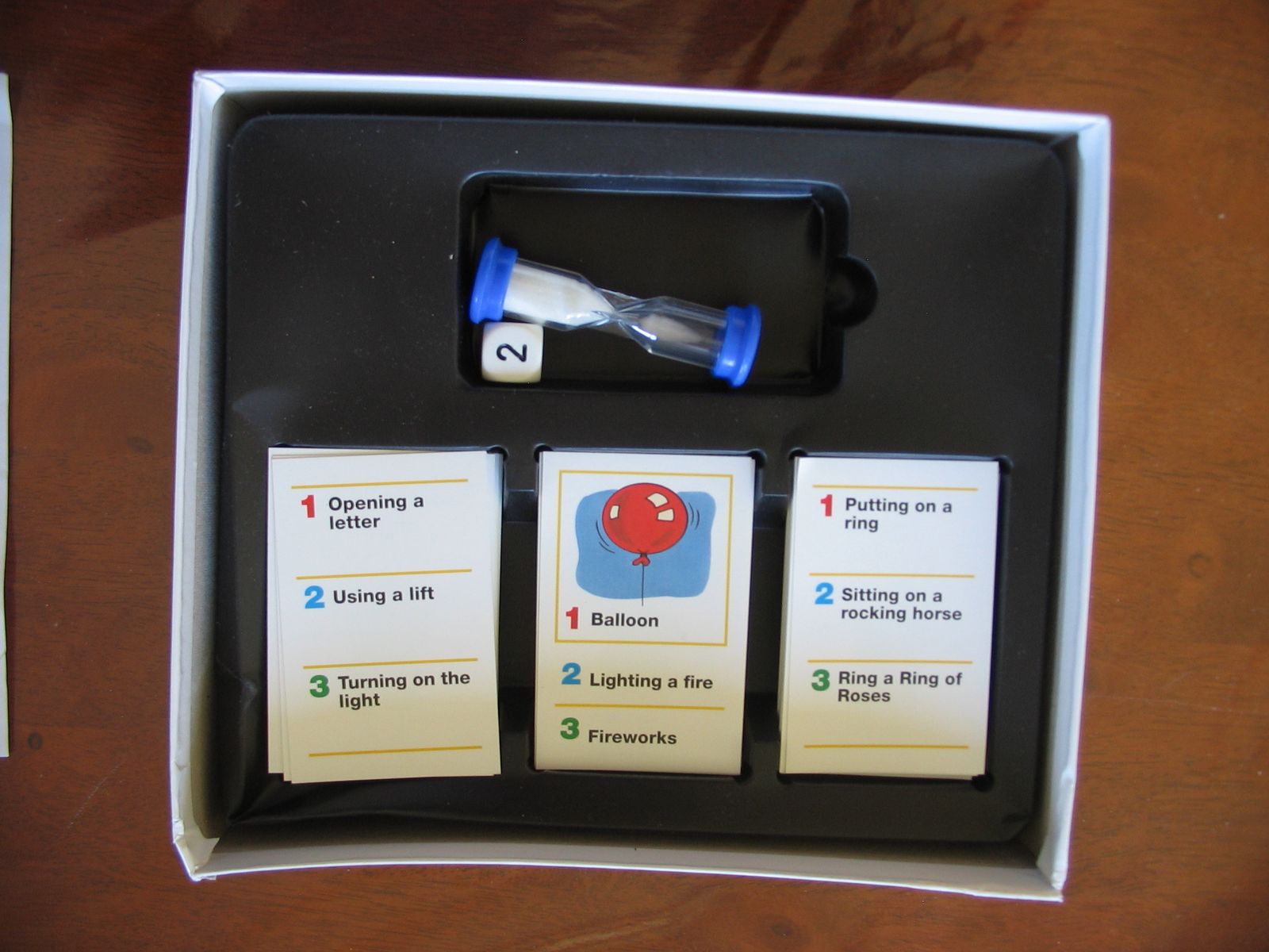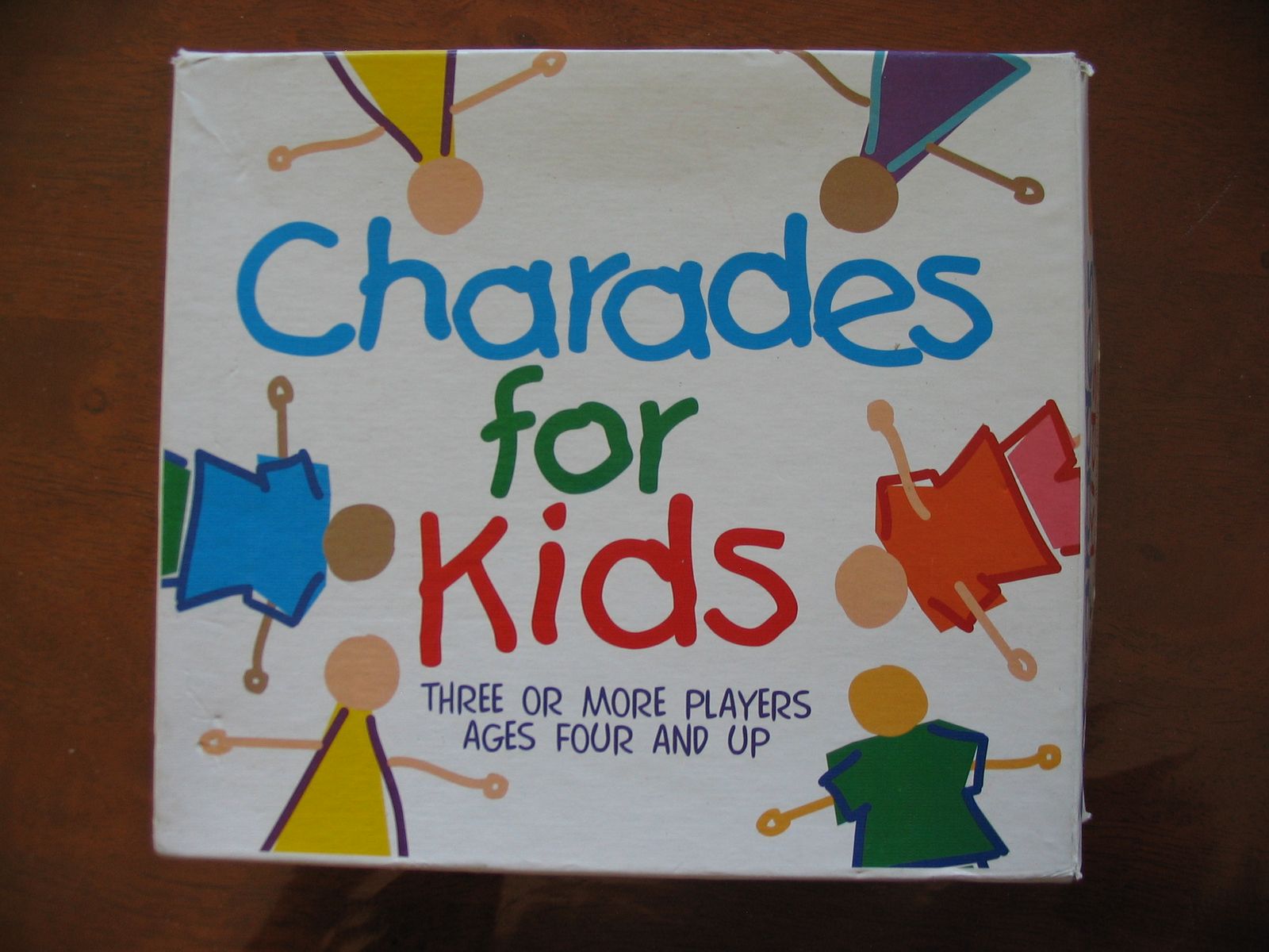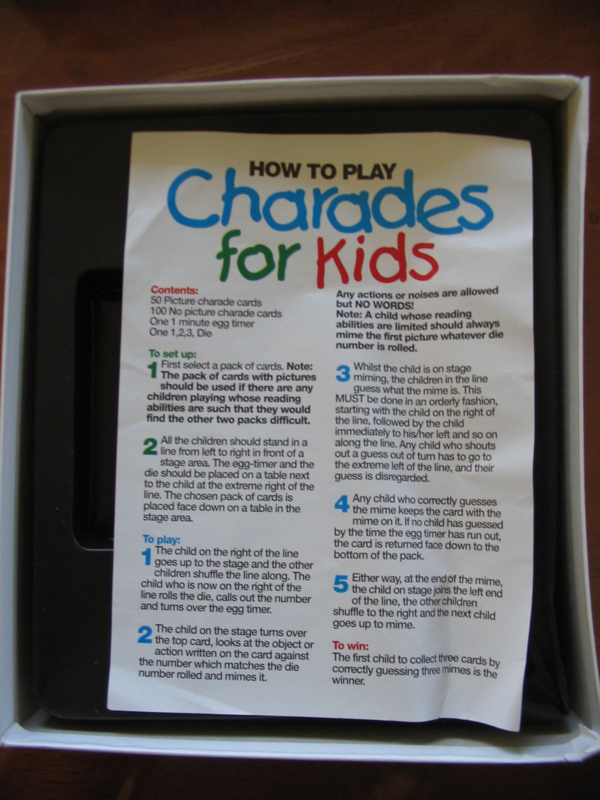 A player draws a card with a list of charades, then rolls a die to see which one to act out. There is also a deck of picture cards for players too young to read. The active player acts out the charade for the player on the left. This player gets only one chance to guess. If incorrect, the next player gets one chance, and so on.