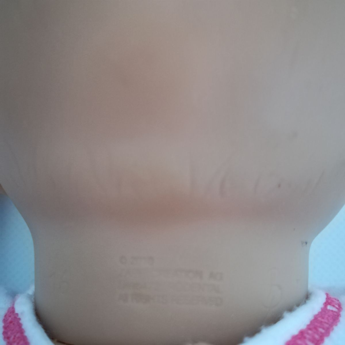 Szájába cumisüveget dugva kortyoló hangot ad, de ez a modell nem mimikál az arcával, nem mozog a szája